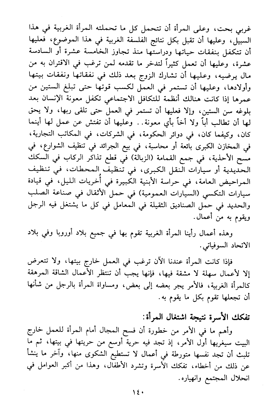 غربي بحت، وعلى المرأة أن تتحمل كل ما تحملته المرأة الغربية في هذا السبيل، وعليها أن تقبل بكل نتائج الفلسفة الغربية في هذا الموضوع، فعليها أن تتكفل بنفقات حياتها ودراستها منذ تجاوز الخامسة عشرة أو السادسة عشرة، وعليها أن تعمل كثيراً لتدخر ما تقدمه لمن ترغب في الاقتران به من مال يرضيه، وعليها أن تشارك الزوج بعد ذلك في نفقاتها ونفقات بيتها وأولادها، وعليها أن تستمر في العمل لكسب قوتها حتى تبلغ الستين من عمرها إذا كانت هنالك أنظمة للتكافل الاجتماعي تكفل معونة الانسان بعد بلوغه سن الستين، وإلا فعليها أن تستمر في العمل حتى تلقى ربها، ولا يحق لها أينما كان، وكيفما كان: في دوائر الحكومة، في الشركات، في المكاتب التجارية، في المخازن الكبرى بائعة أو محاسبة، في بيع الجرائد، في تنظيف الشوارع، في مسح الأحذية، في جمع القمامة (الزبالة) في قطع تذاكر الركاب في السكك الحديدية أو سيارات النقل الكبرى، في تنظيف المحطات، في تنظيف المراحيض العامة، في حراسة الأبنية الكبيرة في أخريات الليل، في قيادة سيارات التكسي (السيارات العمومية) في حمل الاثقال في صناعة الصلب والحديد في حمل الصناديق الثقيلة في المعامل، في كل ما يشتغل فيه الرجل ويقوم به من أعمال.