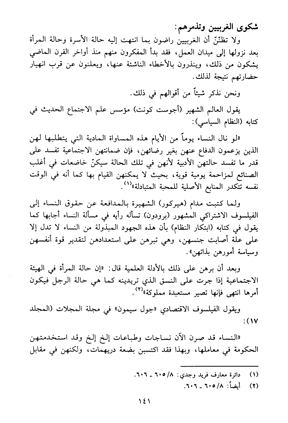 ولا تظن أن الغربيين راضون بما انتهت إليه حالة الأسرة وحالة المرأة بعد نزولها إلى ميدان العمل، فقد بدأ المفكرون منهم منذ أواخر القرن الماضي يشكون من ذلك، وينذرون بالأخطاء الناشئة عنها، ويعلنون عن قرب انهيار حضارتهم نتيجة لذلك.