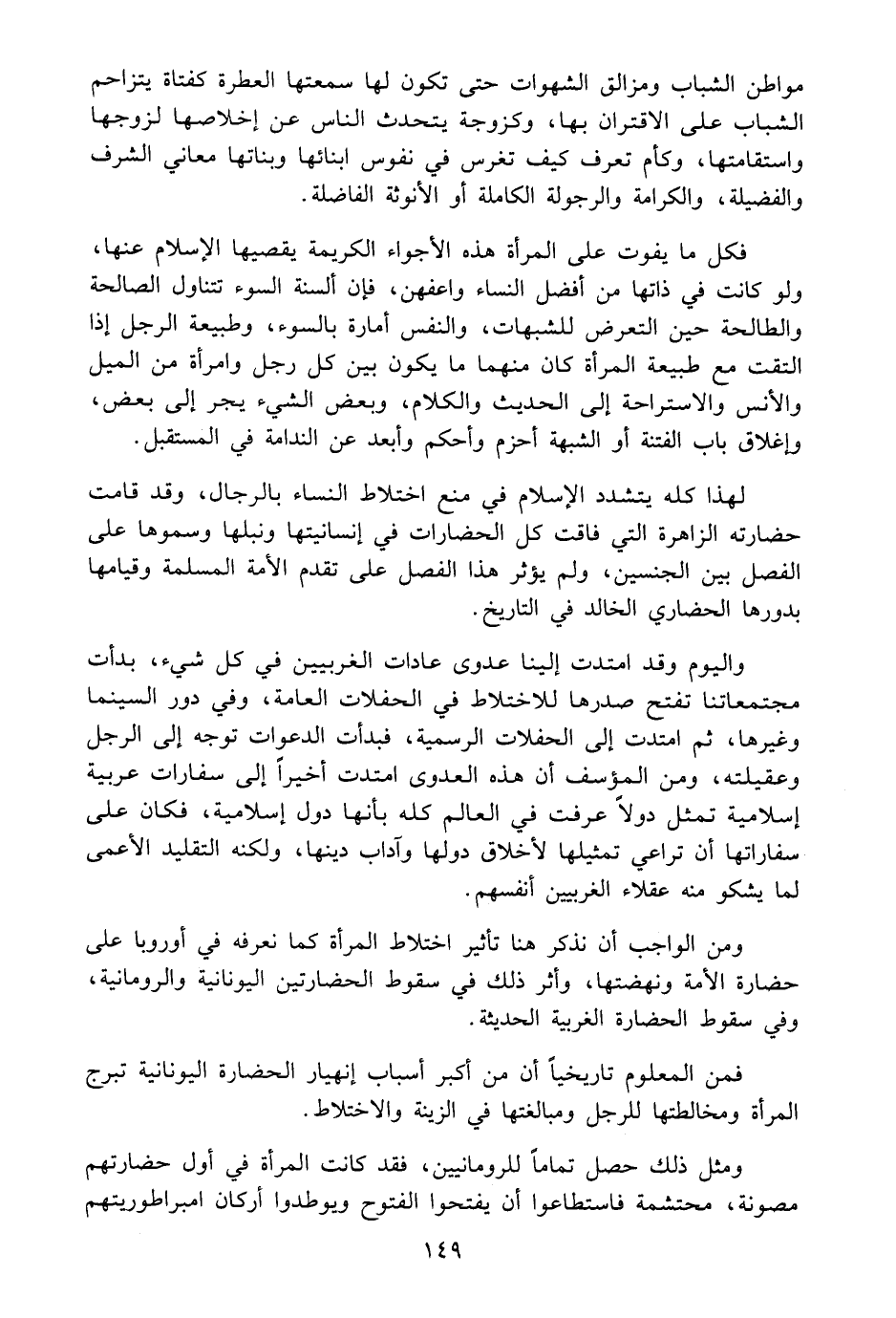 لهذا كله يتشدد الاسلام في منع اختلاط النساء بالرجال، وقد قامت حضارته الزاهرة التي فاقت كل الحضارات في انسانيتها ونبلها وسموها على الفصل بين الجنسين، ولم يؤثر هذا الفصل على تقدم الأمة المسلمة وقيامها بدورها الحضاري الخالد في التاريخ.