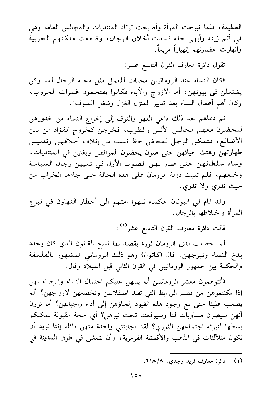 ثم دعاهم بعد ذلك داعي اللهو والترف الى إخراج النساء من خدورهن ليحضرن معهم مجالس الأنس والطرب، فخرجن كخروج الفؤاد من بين الأضالع، فتمكن الرجل لمحض نفسه من اتلاف أخلاقهن وتدنيس طهارتهن وهتك هيائهن حتى صرن يحضرن المراقص ويغنين في المنتديات، وساد سلطانهن حتى صار لهن الصوت الأول في تعيين رجال السياسة وخلعهم، فلم تلبث دولة الرومان على هذه الحالة حتى جاءها الخراب من حيث تدري ولا تدري.