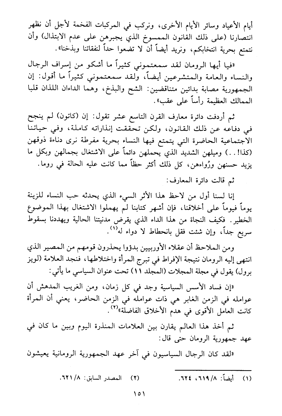 ثم أردفت دائرة معارف القرن التاسع عشر تقول: إن (كاتون) لم ينجح في دفاعه عن ذلك القانون، ولكن تحققت انذاراته كاملة، وفي حياتنا الاجتماعية الحاضرة التي يتمتع فيها النساء بحرية مفرطة نرى دناءة ذوقهن (كذا! ... ) وميلهن الشديد الذي يحملهن دائماً على الاشتغال بجمالهن وبكل ما يزيد حسنهن ورُواءهن، كل ذلك أكثر حظاً مما كانت عليه الحالة في روما.