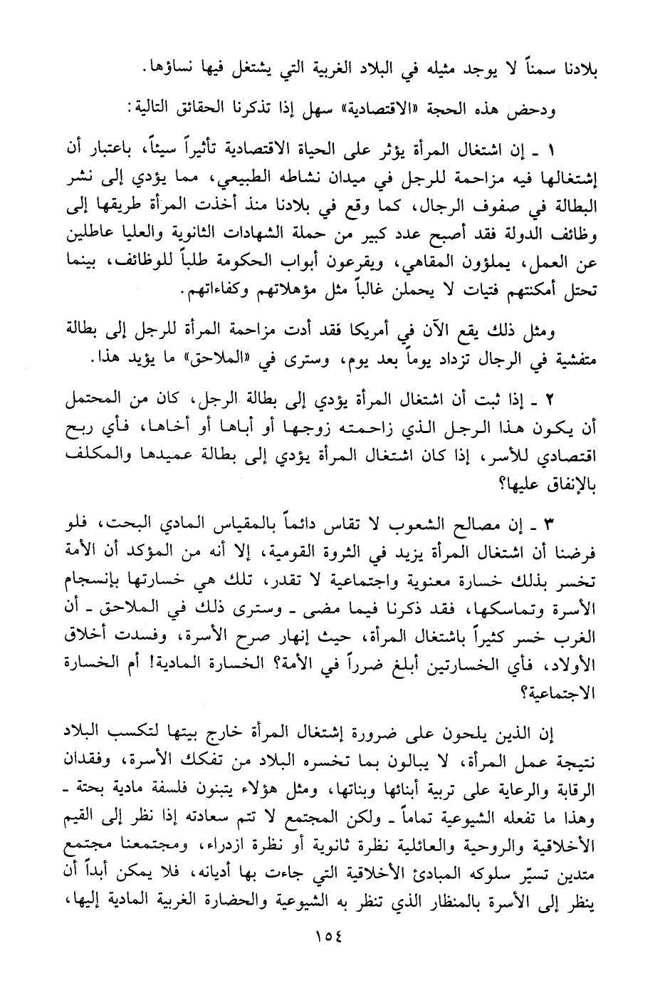 3 - إن مصالح الشعوب لا تقاس دائماً بالمقياس المادي البحت، فلو فرضنا أن اشتغال المرأة يزيد في الثروة القومية، إلا أنه من المؤكد أن الأمة تخسر بذلك خسارة معنوية واجتماعية لا تقدر، تلك هي خسارتها بانسجام الأسرة وتماسكها، فقد ذكرنا فيما مضى - وسترى ذلك في الملاحق - أن الغرب خسر كثيراً باشتغال المرأة، حيث انهار صرح الأسرة، وفسدت أخلاق الأولاد، فأي الخسارتين أبلغ ضرراً في الأمة؟ الخسارة المادية! أم الخسارة الاجتماعية!