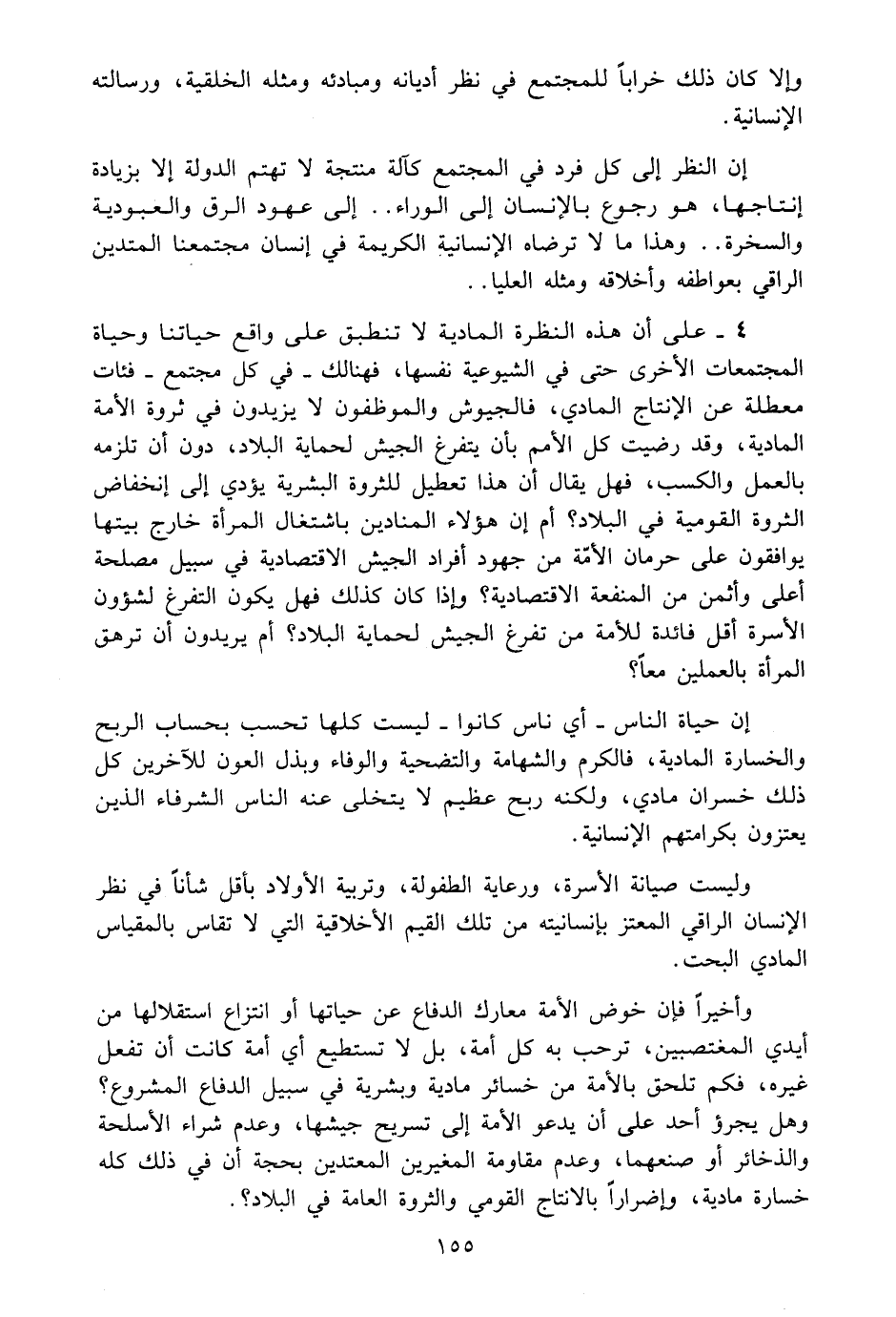 4 - على أن هذه النظرة المادية لا تنطبق على واقع حياتنا وحياة المجتمعات الأخرى حتى في الشيوعية نفسها، فهنالك - في كل مجتمع - فئات معطلة عن الانتاج المادي، فالجيوش والموظفون لا يزيدون في ثروة الأمة المادية، وقد رضيت كل الأمم بأن يتفرغ الجيش لحماية البلاد، دون أن تلزمه بالعمل والكسب، فهل يقال أن هذا تعطيل للثروة البشرية يؤدي الى انخفاض الثروة القومية في البلاد؟ أم إن هؤلاء المنادين باشتغال المرأة خارج بيتها يوافقون على حرمان الأمة من جهود أفراد الجيش الاقتصادية في سبيل مصلحة أعلى وأثمن من المنفعة الاقتصادية؟ وإذا كان كذلك فهل يكون التفرغ لشؤون الأسرة أقل فائدة للأمة من تفرغ الجيش لحماية البلاد؟ أم يريدون أن ترهق المرأة بالعملين معاً؟