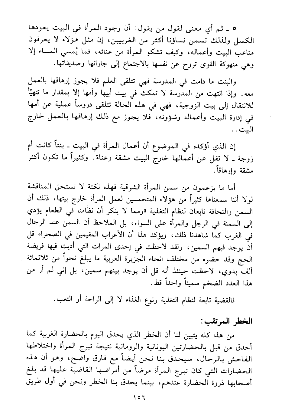 5 - ثم أي معنى لقول من يقول: ان وجود المرأة في البيت يعودها الكسل ولذلك تسمن نساؤنا أكثر من الغربيين، إن مثل هؤلاء لا يعرفون متاعب البيت وأعماله، وكيف تشكو المرأة من عنائه، فما يمسي المساء إلا وهي منهوكة القوى تروح عن نفسها بالاجتماع الى جاراتها وصديقاتها.