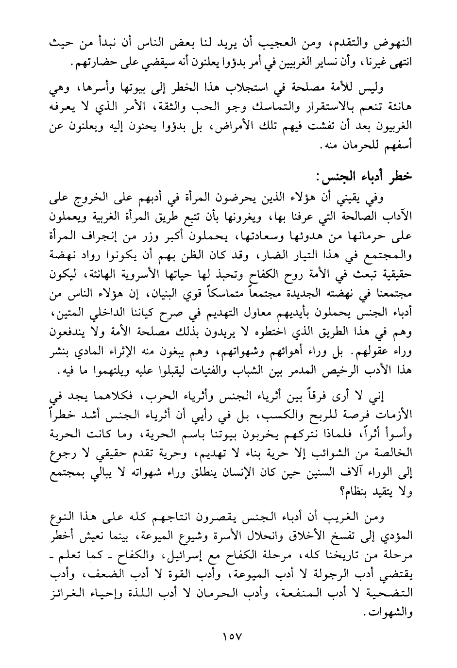 وفي يقيني أن هؤلاء الذين يحرضون المرأة في أدبهم على الخروج على الآداب الصالحة التي عرفنا بها، ويغرونها بأن تتبع طريق المرأة الغربية ويعملون على حرمانها من هدوئها وسعادتها، يحملون أكبر وزر من انجراف المرأة والمجتمع في هذا التيار الضار، وقد كان الظن بهم أن يكونوا رواد نهضة حقيقية تبعث في الأمة روح الكفاح وتحبذ لها حياتها الأسروية الهانئة، ليكون مجتمعنا في نهضته الجديدة مجتمعاً متماسكاً قوي البنيان، إن هؤلاء الناس من أدباء الجنس يحملون بأيديهم معاول التهديم في صرح كياننا الداخلي المتين، وهم في هذا الطريق الذي اختطوه لا يريدون بذلك مصلحة الأمة ولا يندفعون وراء عقولهم. بل وراء أهوائهم وشهواتهم، وهم يبغون منه الاثراء المادي بنشر هذا الأدب الرخيص المدمر بين الشباب والفتيات ليقبلوا عليه ويلتهموا ما فيه. إني لا أرى فرقاً بين أثرياء الجنس وأثرياء الحرب، فكلاهما يجد في الأزمات فرصة للربح والكسب، بل في رأيي ان أثرياء الجنس أشد خطراً وأسوأ أثراً، فلماذا نتركهم يخربون بيوتنا باسم الحرية، وما كانت الحرية الخالصة من الشوائب إلا حرية بناء لا تهديم، وحرية تقدم حقيقي لا رجوع الى الوراء آلاف السنين حين كان الانسان ينطلق وراء شهواته لا يبالي بمجتمع ولا يتقيد بنظام؟