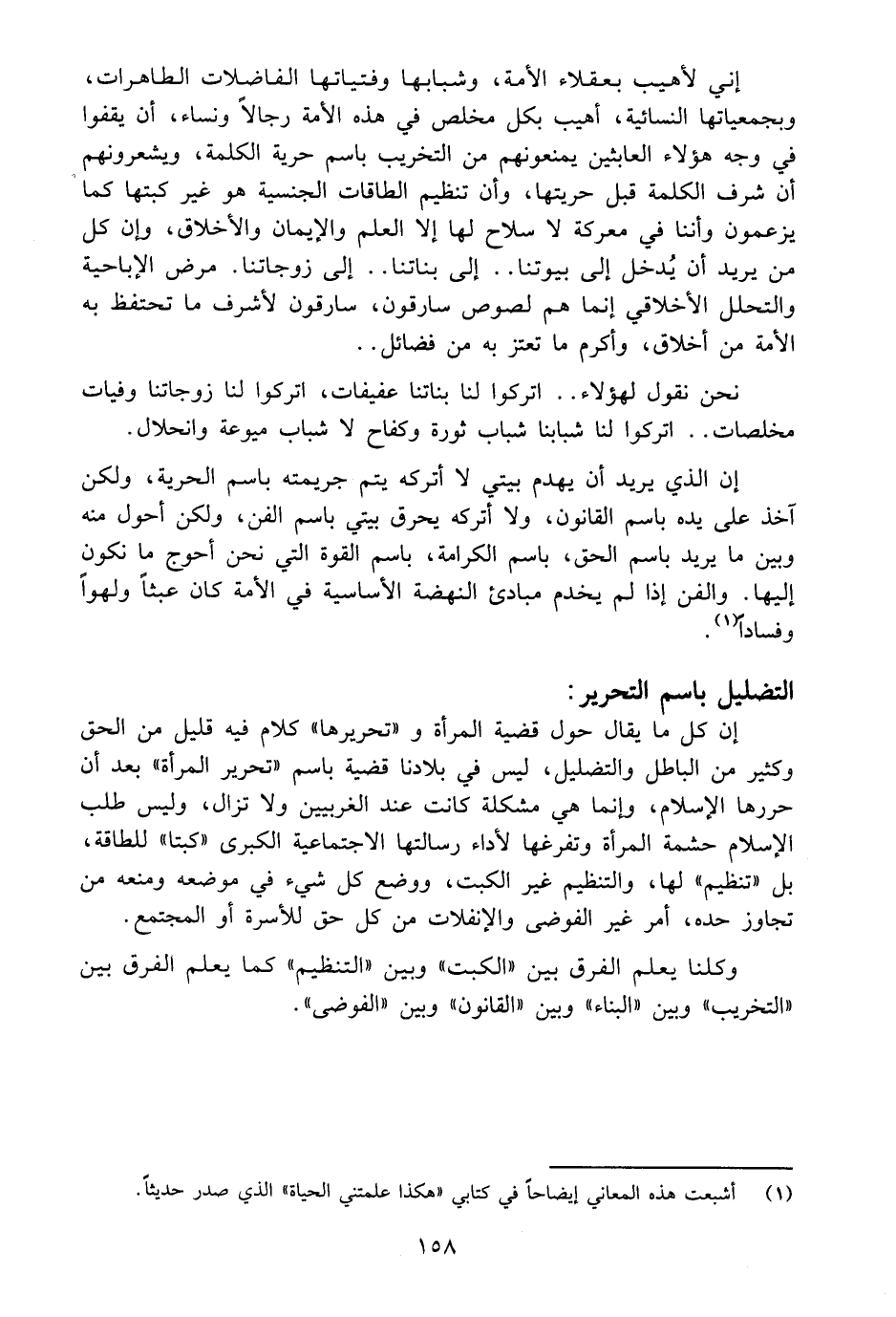 إني لأهيب بعقلاء الأمة، وشبابها وفتياتها الفاضلات الطاهرات، وبجمعياتها النسائية، أهيب بكل مخلص في هذه الأمة رجالاً ونساءً، أن يقفوا في وجه هؤلاء العابثين يمنعونهم من التخريب باسم حرية الكلمة، ويشعرونهم أن شرف الكلمة قبل حريتها، وأن تنظيم الطاقات الجنسية هو غير كبتها كما يزعمون وأننا في معركة لا سلاح لها إلا العلم والإيمان والاخلاق، وإن كل من يريد أن يُدخل الى بيوتنا .. الى بناتنا ... الى زوجاتنا .. مرض الاباحية والتحلل الأخلاقي إنما هم لصوص سارقون، سارقون لأشرف ما تحتفظ به الأمة من أخلاق، وأكرم ما تعتز به من فضائل ..