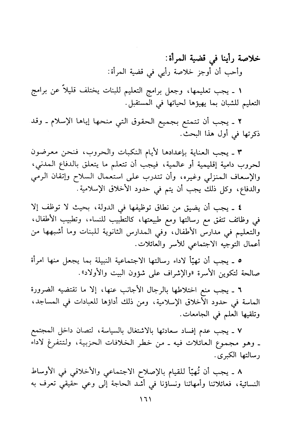 6 - يجب منع اختلاطها بالرجال الأجانب عنها، إلا ما تقتضيه الضرورة الماسة في حدود الأخلاق الاسلامية، ومن ذلك أداؤها للعبادات في المساجد، وتلقيها العلم في الجامعات.