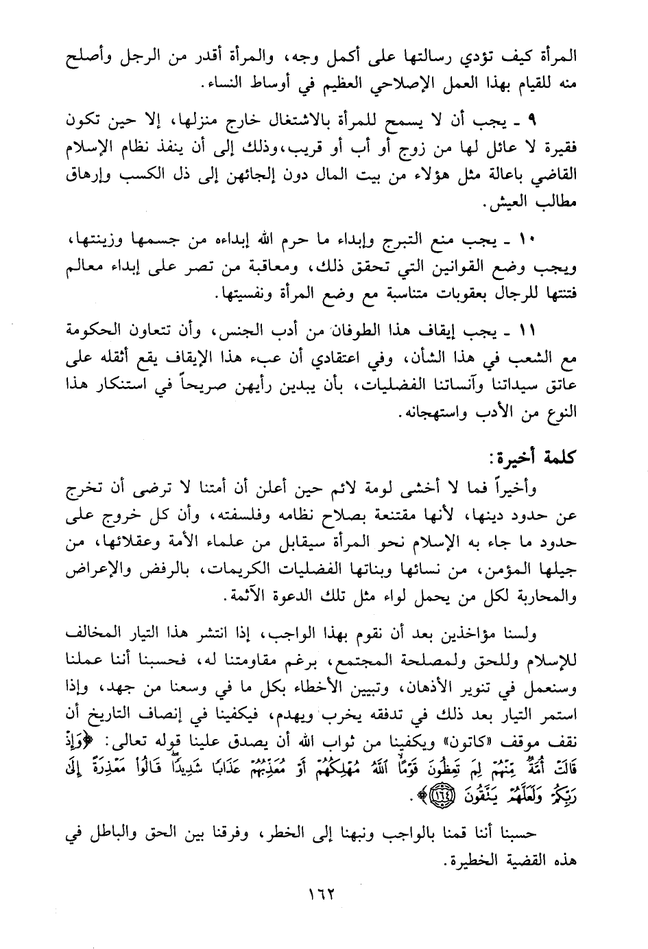 وأخيراً فما لا أخشى لومة لائم حين أعلن أن أمتنا لا ترضى أن تخرج عن حدود دينها، لأنها مقتنعة بصلاح نظامه وفلسفته، وأن كل خروج على حدود ما جاء به الاسلام نحو المرأة سيقابل من علماء الأمة وعقلائها، من جيلها المؤمن، من نسائها وبناتها الفضيلات الكريمات، بالرفض والاعراض والمحاربة لكل من يحمل لواء مثل تلك الدعوة الآثمة.