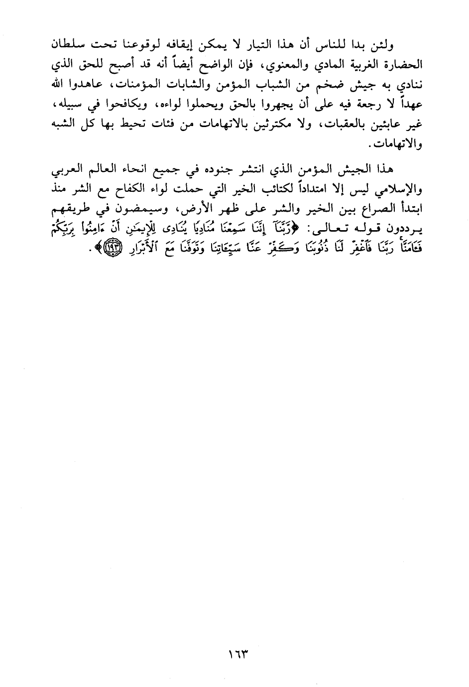 ولئن بدا للناس أن هذا التيار لا يمكن ايقافه لوقوعنا تحت سلطان الحضارة الغربية المادي والمعنوي، فان الواضح أيضاً أنه قد أصبح للحق الذي ننادي به جيش ضخم من الشباب المؤمن والشابات المؤمنات، عاهدوا الله عهداً لا رجعة فيه على أن يجهروا بالحق ويحملوا لواءه، ويكافحوا في سبيله، غير عابئين بالعقبات، ولا مكترثين بالاتهامات من فئات تحيط بها كل الشبه والاتهامات.