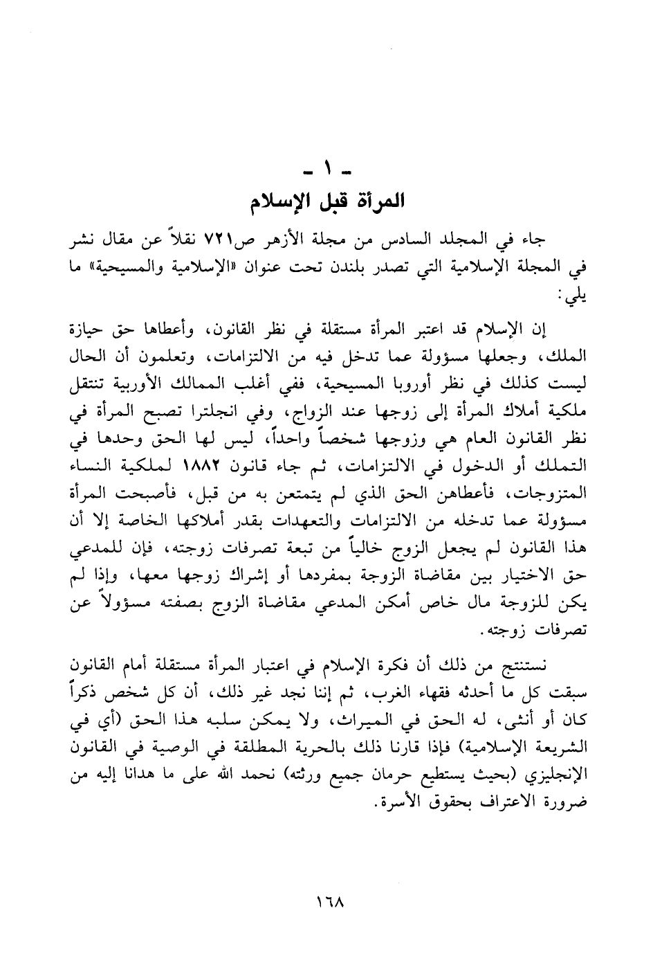 إن الاسلام قد اعتبر المرأة مستقلة في نظر القانون، وأعطاها حق حيازة الملك، وجعلها مسؤولة عما تدخل فيه من الالتزامات، وتعلمون أن الحال ليست كذلك في نظر أوروبا المسيحية، ففي أغلب الممالك الأوروبية تنتقل ملكية أملاك المرأة الى زوجها عند الزواج، وفي انجلترا تصبح المرأة في نظر القانون العام هي وزوجها شخصاً واحداً، ليس لها الحق وحدها في التملك أو الدخول في الالتزامات، ثم جاء قانون 1882 لملكية النساء المتزوجات، فأعطاهن الحق الذي لم يتمتعن به من قبل، فأصبحت المرأة مسؤولة عما تدخله من الالتزامات والتعهدات بقدر أملاكها الخاصة إلا أن هذا القانون لم يجعل الزوج خالياً من تبعة تصرفات زوجته، فإن للمدعي حق الاختيار بين مقاضاة الزوجة بمفردها أو إشراك زوجها معها، وإذا لم يكن للزوجة مال خاص أمكن للمدعي مقاضاة الزوج بصفته مسؤولاً عن تصرفات زوجته.