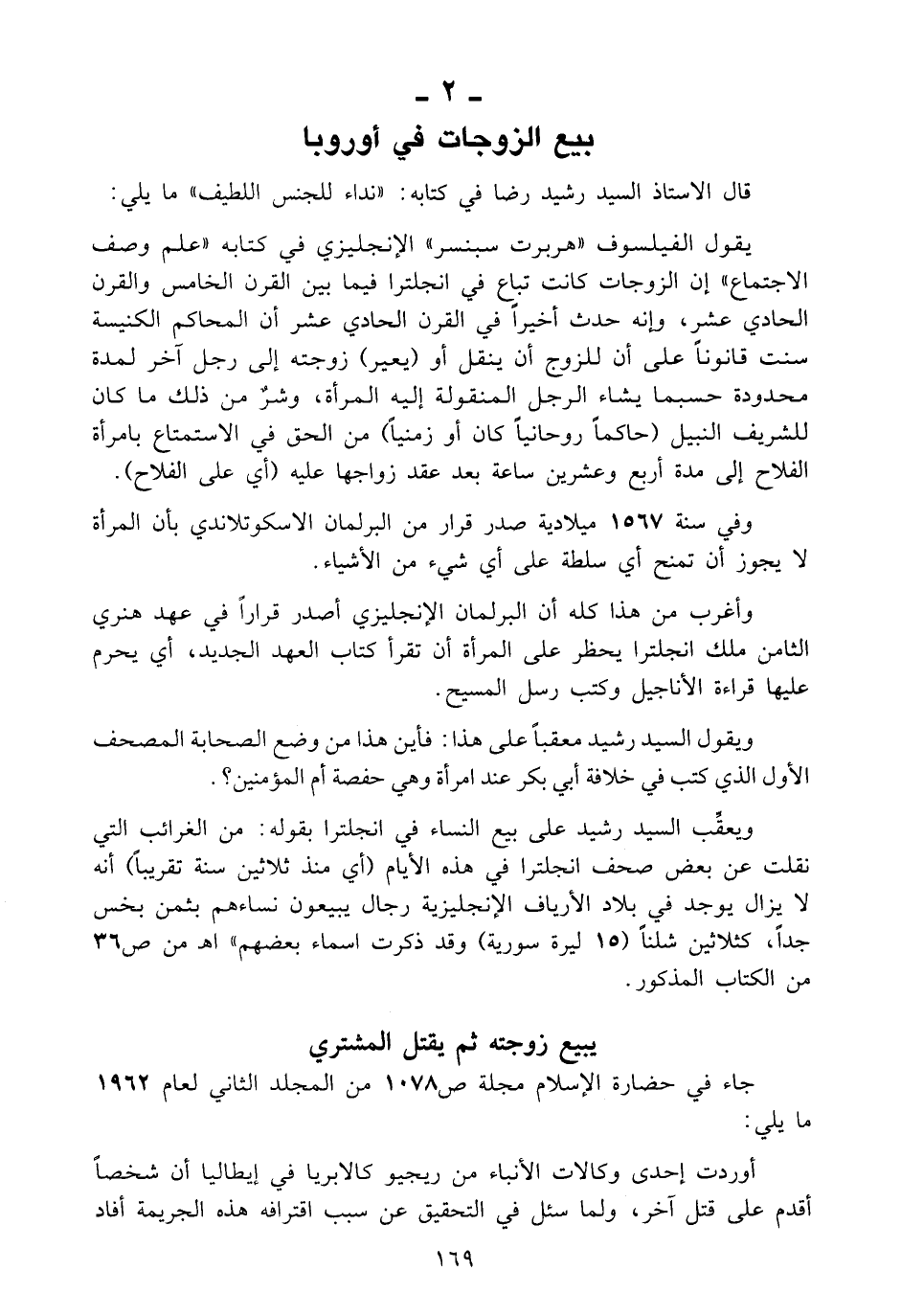 ويعقب السيد رشيد على بيع النساء في انجلترا بقوله: من الغرائب التي نقلت عن بعد صحف انجلترا في هذه الأيام (أي منذ ثلاثين سنة تقريباً) أنه لا يزال يوجد في بلاد الارياف الانجليزية رجال يبيعون نساءهم بثمن بخس جداً، كثلاثين شلناً (15 ليرة سورية) وقد ذكرت أسماء بعضهم " 1. همن ص 36 من الكتاب المذكور.