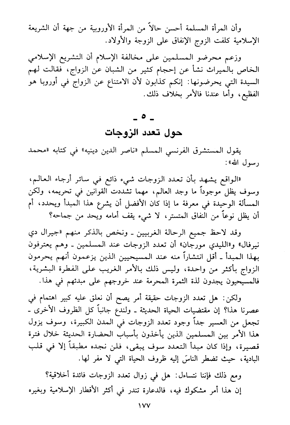 ولكن: هل تعدد الزوجات حقيقة أمر يصح أن نعلق عليه كبير اهتمام في عصرنا هذا؟ إن مقتضيات الحياة الحديثة - ولندع جانباً كل الظروف الأخرى - تجعل من العسير جداً وجود تعدد الزوجات في المدن الكبيرة، وسوف يزول هذا الأمر بين المسلمين الذين يأخذون بأسباب الحضارة الحديثة خلال فترة قصيرة، واذا كان مبدأ التعدد سوف يبقى، فلن نجده مطبقاً إلا في قلب البادية، حيث تضطر الناس اليه ظروف الحياة التي لا مفر لها.