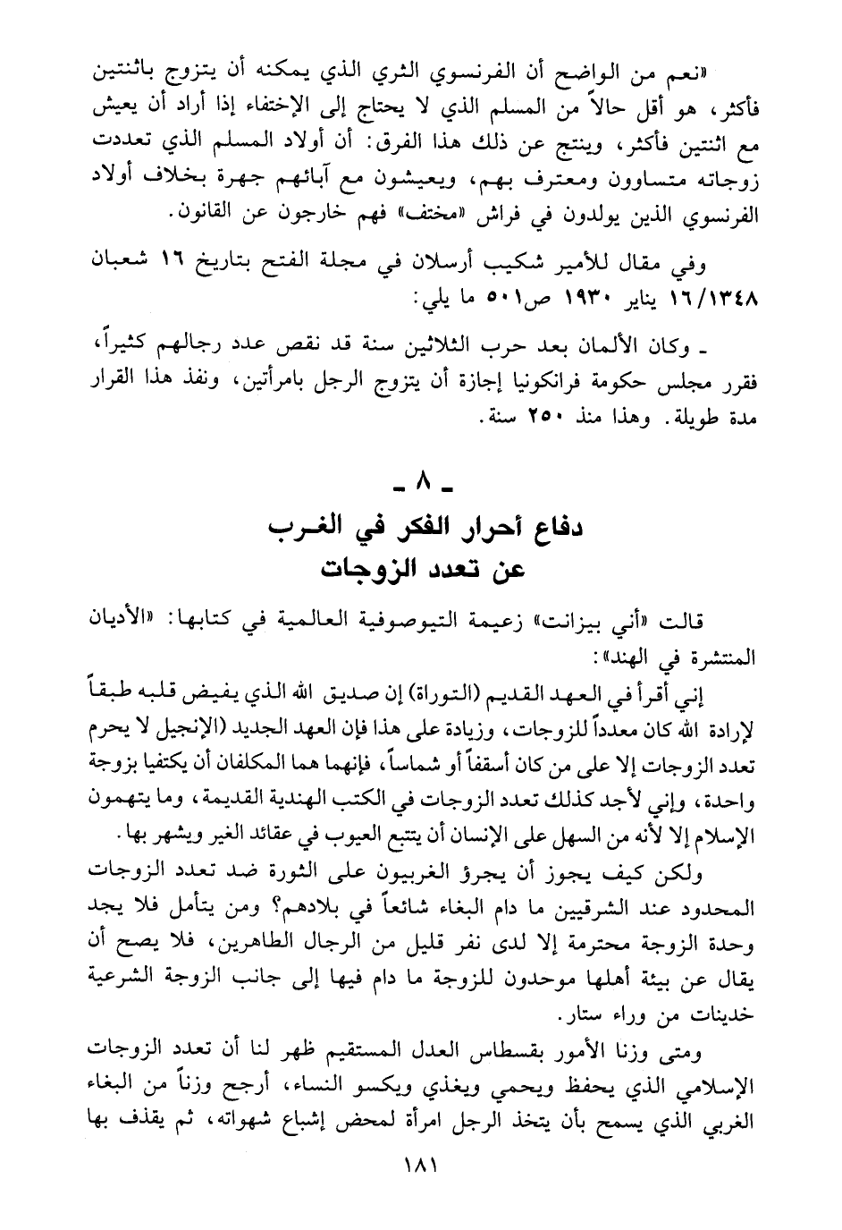 ولكن كيف يحوز أن يجرؤ الغربيون على الثورة ضد تعدد الزوجات المحدود عند الشرقيين ما دام البغاء شائعاً في بلادهم! ومن يتأمل فلا يجد وحدة الزوجة محترمة إلا لدى نفر قليل من الرجال الطاهرين، فلا يصح أن يقال عن بيئة أهلها موحدون للزوجة ما دام فيها الى جانب الزوجة الشرعية خدينات من وراء ستار.