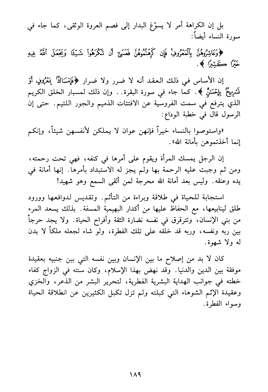 كان لا بد من اصلاح ما بين الانسان وبين نفسه التي بين جنبيه بعقيدة موفقة بين الدين والدنيا. وقد نهض بهذا الاسلام، وكانت سنته في الزواج كفاء خطته في جوانب الهداية البشرية الفطرية، لتحرير البشر من الذعر، والخزي وعقيدة الاثم الشوهاء التي كبلته ولم تزل تكبل الكثيرين عن انطلاقة الحياة وسواء الفطرة.