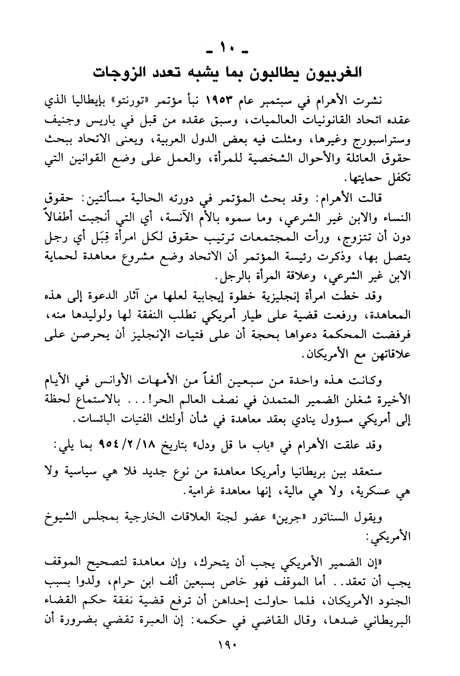 إن الضمير الأمريكي يجب أن يتحرك، وإن معاهدة لتصحيح الموقف يجب أن تعقد .. أما الموقف فهو خاص بسبعين ألف ابن حرام، ولدوا بسبب الجنود الأمريكان، فلما حاولت إحداهن أن ترفع قضية نفقة حكم القضاء البريطاني ضدها، وقال القاضي في حكمه: إن العبرة تقضي بضرورة أن