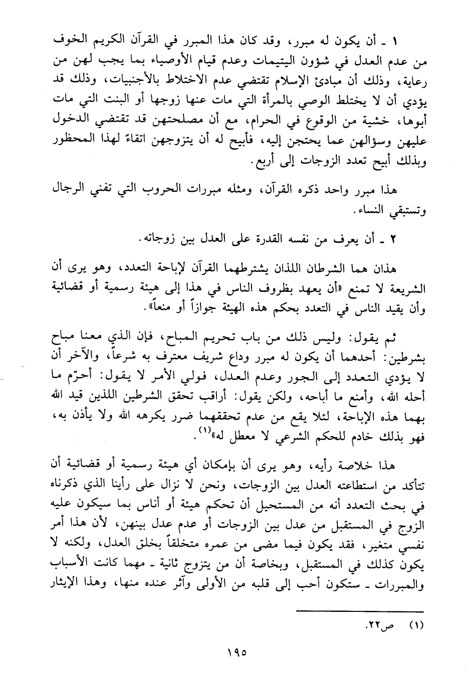 هذان هما الشرطان اللذان يشترطهما القرآن لإباحة التعدد، وهو يرى أن الشريعة لا تمنع "أن يعهد بظروف الناس في هذا الى هيئة رسمية أو قضائية وأن يقيد الناس في التعدد بحكم هذه الهيئة جوازاً أو منعاً".