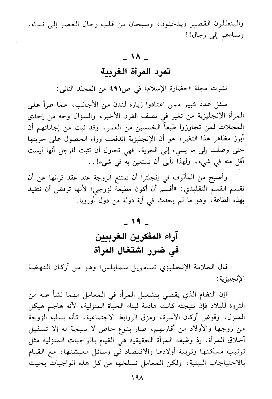 "إن النظام الذي يقضي بتشغيل المرأة في المعامل مهما نشأ عنه من الثروة للبلاد فان نتيجته كانت هادمة لبناء الحياة المنزلية، لأنه هاجم هيكل المنزل، وقوض أركان الأسرة، ومزق الروابط الاجتماعية، فإنه بسلبه الزوجة من زوجها والأولاد من أقاربهم، صار بنوع خاص لا نتيجة له إلا تسفيل أخلاق المرأة، إذ وظيفة المرأة الحقيقية هي القيام بالواجبات المنزلية مثل ترتيب مسكنها وتربية أولادها والاقتصاد في وسائل معيشتها، مع القيام بالاحتياجات البيتية، ولكن المعامل تسلخها من كل هذه الواجبات بحيث