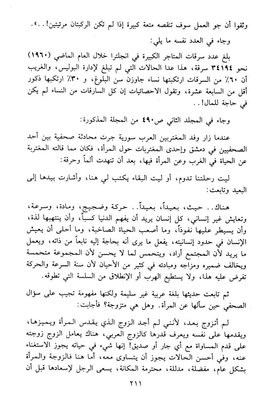 عندما زار وفد المغتربين العرب سورية جرت محادثة صحفية بين احد الصحفيين في دمشق واحدى المغتربات حول المرأة، فكان مما قالته المغتربة عن الحياة في الغرب وعن المرأة فيها، بعد أن تنهدت ألماً وحرقة: