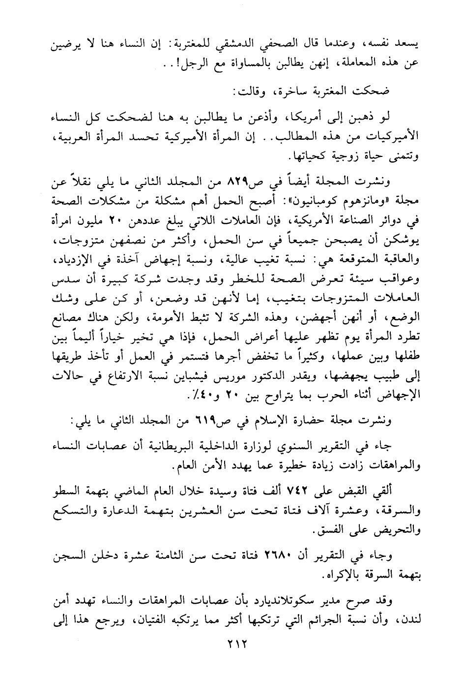 ونشرت المجلة أيضاً في ص 829 من المجلد الثاني ما يلي نقلاً عن مجلة "ومانزهوم كومبانيون": أصبح الحمل أهم مشكلة من مشكلات الصحة في دوائر الصناعة الأمريكية، فإن العاملات اللاتي يبلغ عددهن 20 مليون امرأة يوشكن أن يصبحن جميعاً في سن الحمل، وأكثر من نصفهن متزوجات، والعاقبة المتوقعة هي: نسبة تغيب عالية، ونسبة اجهاض آخذة في الازدياد، وعواقب سيئة تعرض الصحة للخطر، وقد وجدت شركة كبيرة أن سدس العاملات المتزوجات بتغيب، إما لأنهن قد وضعن، أو كن على وشك الوضع، أو أنهن أجهضن، وهذه الشركة لا تثبط الأمومة، ولكن هناك مصانع تطرد المرأة يوم تظهر عليها أعراض الحمل، فإذا هي تخير خياراً أليماً بين طفلها وبين عملها، وكثيراً ما تخفض أجرها فتستمر في العمل أو تأخذ طريقها الى طبيب يجضها، ويقدر الدكتور موريس فيشباين نسبة الارتفاع في حالات الاجهاض أثناء الحرب بما يترواح بين 20 و 40%.