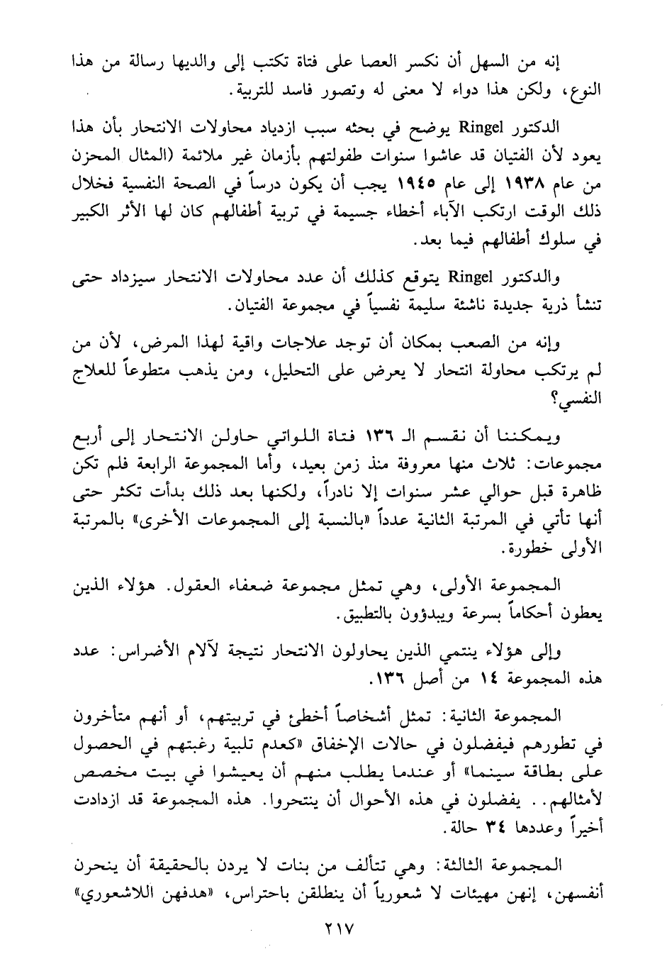 والدكتور Ringel يتوقع كذلك أن عدد محاولات الانتحار سيزداد حتى تنشأ ذرية جديدة ناشئة سليمة نفسياً في مجموعة الفتيان.