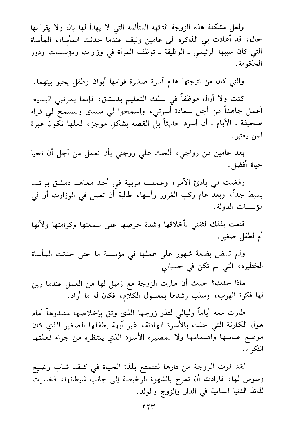ولعل مشكلة هذه الزوجة التائهة المتألمة التي لا يهدأ لها بال ولا يقر لها حال، قد اعادت بي الذاكرة الى عامين ونيف عندما حدثت المأساة: المأساة التي كان سببها الرئيسي - الوظيفة - توظف المرأة في وزارات ومؤسسات ودور الحكومة.