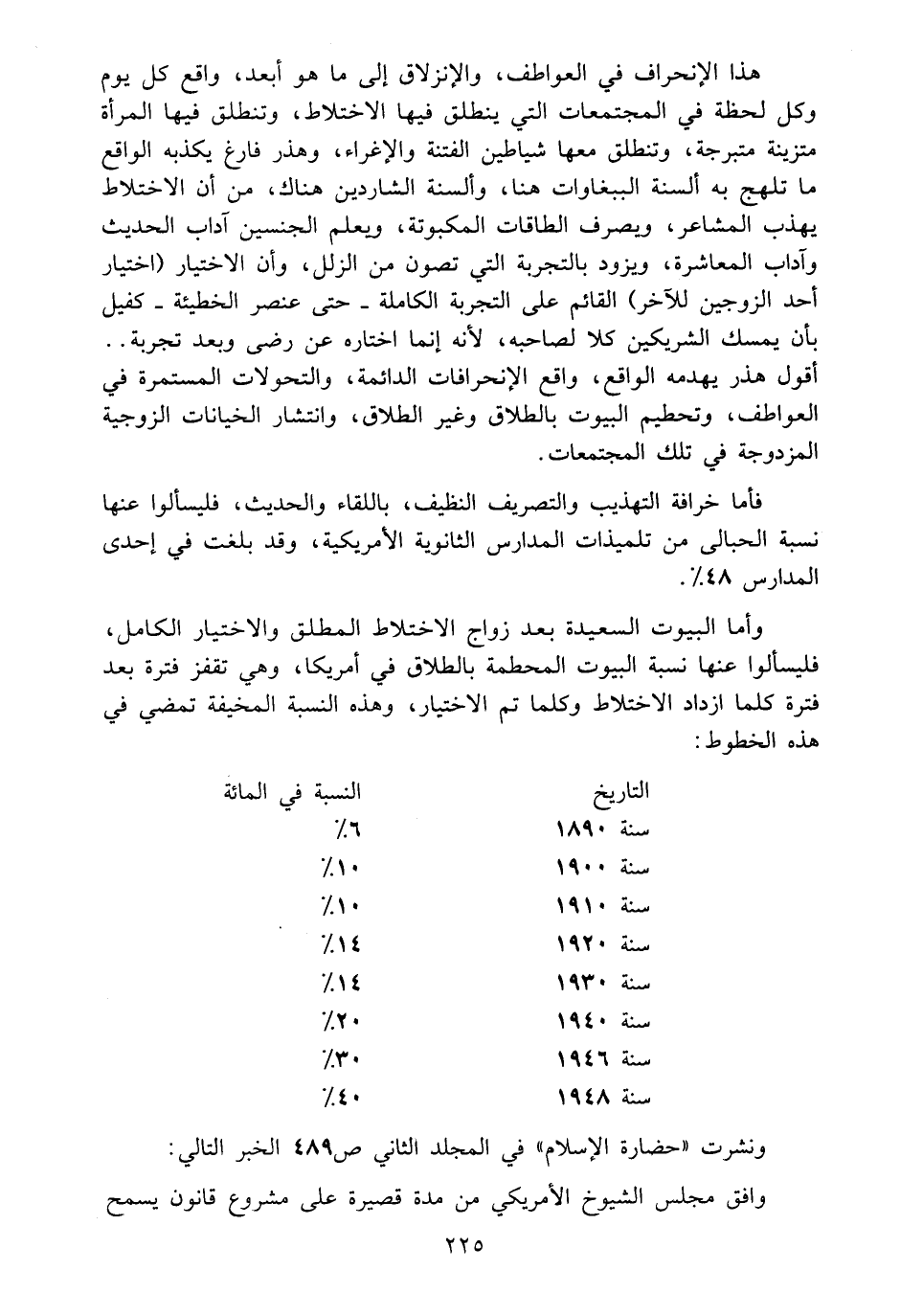 وأما البيوت السعيدة بعد زواج الاختلاط المطلق والاختيار الكامل، فليسألوا عنها نسبة البيوت المحطمة بالطلاق في أمريكا، وهي تقفز فترة بعد فترة كلما ازداد الاختلاط وكلما تم الاختيار، وهذه النسبة المخيفة تمضي في هذه الخطوط: