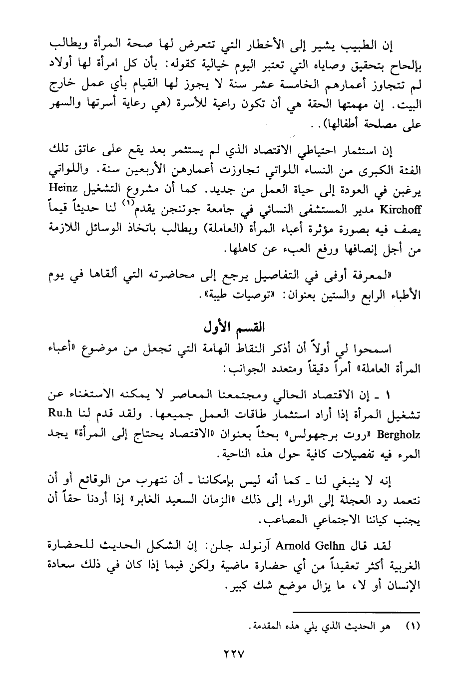 ان استثمار احتياطي الاقتصاد الذي لم يستثمر بعد يقع على عاتق تلك الفئة الكبرى من النساء اللواتي تجاوزت أعمارهن الأربعين سنة. واللواتي يرغبن في العودة الى حياة العمل من جديد. كما أن مشروع التشغيل "النصف يومي" للمرأة أمر يجب أن يتم. ان الدكتور هانسي كير خهوف Heinz Kirchoff مدير المستشفى النسائي في جامعة جوتنجن يقدم (¬1) لنا حديثاً فيما يصف فيه بصورة مؤثرة أعباء المرأة (العاملة) ويطالب باتخاذ الوسائل اللازمة من أجل انصافها ورفع العبء عن كاهلها.