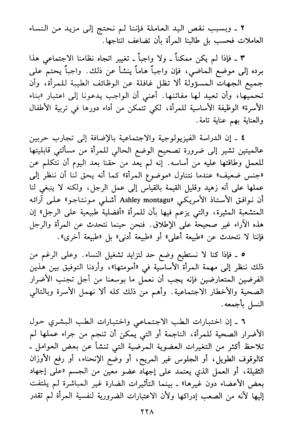 4 - ان الدراسة الفيزيولوجية والاجتماعية بالاضافة الى تجارب حربين عالميتين تشير الى ضرورة تصحيح الوضع الحالي للمرأة من مسألتي قابليتها للعمل وطاقتها عليه من أساسه. انه لم يعد من حقنا بعد اليوم أن نتكلم عن "جنس ضعيف" عندما نتناول "موضوع المرأة" كما أنه لا يحق لنا أن ننظر الى عملها على أنه زهيد وقليل القيمة بالقياس الى عمل الرجل، ولكنه لا ينبغي لنا أن نوافق الاستاذ الامريكي " Ashley Montagu" اشلي مونتاجو، على آرائه المتشعبة المثيرة، والتي يزعم فيها بأن للمرأة "أفضلية طبيعية على الرجل" إن هذه الآراء غير صحيحة على الاطلاق. فنحن حينما نتحدث عن المرأة والرجل فاننا لا نتحدث عن "طبيعة أعلى" أو "طبيعة أدنى" بل "طبيعة أخرى".