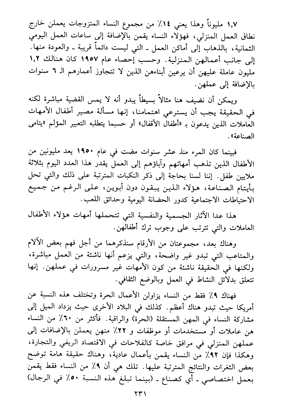 فبينما كان المرء منذ عشر سنوات مضت في عام 1950 يعد مليونين من الاطفال الذين تذهب أمهاتهم وآباؤهم الى العمل يقدر هذا العدد اليوم بثلاثة ملايين طفل. إننا لسنا بحاجة الى ذكر النكبات المترتبة على ذلك والتي تحل بايتام الصناعة، هؤلاء الذين يبقون دون أبوين، على الرغم من جميع الاحتياطات الاجتماعية كدور الحضانة اليومية وحدائق اللعب.