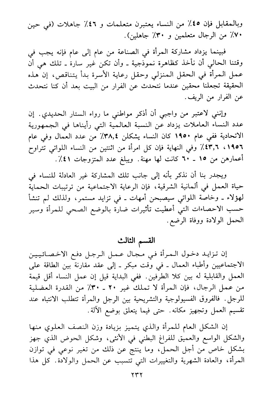 فبينما يزداد مشاركة المرأة في الصناعة من عام الى عام فانه يجب في وقتنا الحالي ان نأخذ كظاهرة نموذجية - وان تكن غير سارة - تلك هي أن عمل المرأة في الحقل المنزلي وحقل رعاية الأسرة بدأ يتناقص، إن هذه الحقيقة تجعلنا محقين عندما نتحدث عن الفرار من البيت بعد أن كنا نتحدث عن الفرار من الريف.
