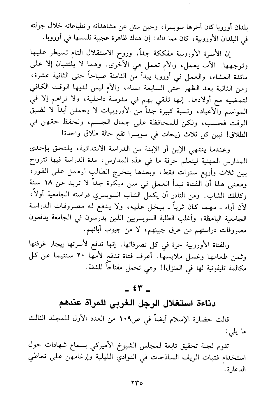 ان الأسرة الأوروبية مفككة جداً، وروح الاستقلال التام تسيطر عليها وتوجهها. الأب يعمل، والأم تعمل هي الأخرى. وهما لا يلتقيان إلا على مائدة العشاء، والعمل في أوروبا يبدأ من الثامنة صباحاً حتى الثانية عشرة، ومن الثانية بعد الظهر حتى السابعة مساء، والأم ليس لديها الوقت الكافي لتمضيه مع أولادها. إنها تلتقي بهم في مدرسة داخلية، ولا تراهم إلا في المواسم والأعياد، ونسبة كبيرة جداً من الأوروبيات لا يحملن أبداً لا لضيق الوقت فحسب، ولكن للمحافظة على جمال الجسم، ولحفظ حقهن في الطلاق! فبين كل ثلاث زيجات في سويسرا تقع حالة طلاق واحدة!