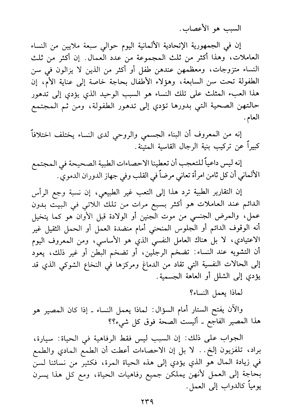 الجواب على ذلك: ان السبب ليس فقط الرفاهية في الحياة: سيارة براد، تلفزيون الخ .. لا بل ان الاحصاءات أعطت أن الطمع المادي والطمع في زيادة المال هو الذي يؤدي الى هذه الحياة المرة، فكثير من نسائنا لسن بحاجة الى العمل لانهن يملكن جميع رفاهيات الحياة، ومع كل هذا يسرن يومياً كالدواب الى العمل.