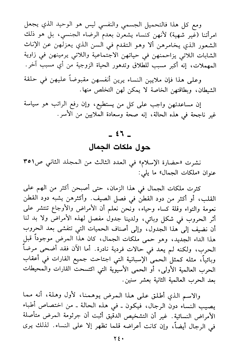 كثرت ملكات الجمال في هذا الزمان، حتى أصبحن أكثر من الهم على القلب، أو أكثر من دود القطن في فصل الصيف. وأكثرهن يشبه دود القطن نعومة والتواء وقلة كساء وحياء، ونحن نعلم أن الأمراض والأوجاع تنتشر على أثر الحروب في شكل وبائي، ولدينا جدول مفصل لهذه الأمراض ولا بد لنا أن نضيف الى هذا الجدول، والى أصناف الحميات التي تتفشى بعد الحروب هذا الداء الجديد، وهو حمى ملكات الجمال، كان هذا المرض موجوداً قبل الحرب، ولكنه لم يعدو في حالات فردية نادرة. أما الآن فقد أضحى مرضاً وبائياً، مثله كمثل الحمى الاسبانية التي اجتاحت جميع القارات في أعقاب الحرب العالمية الأولى، أو الحمى الاسيوية التي اكتسحت القارات والمحيطات بعد الحرب العالمية الثانية بعشر سنين.