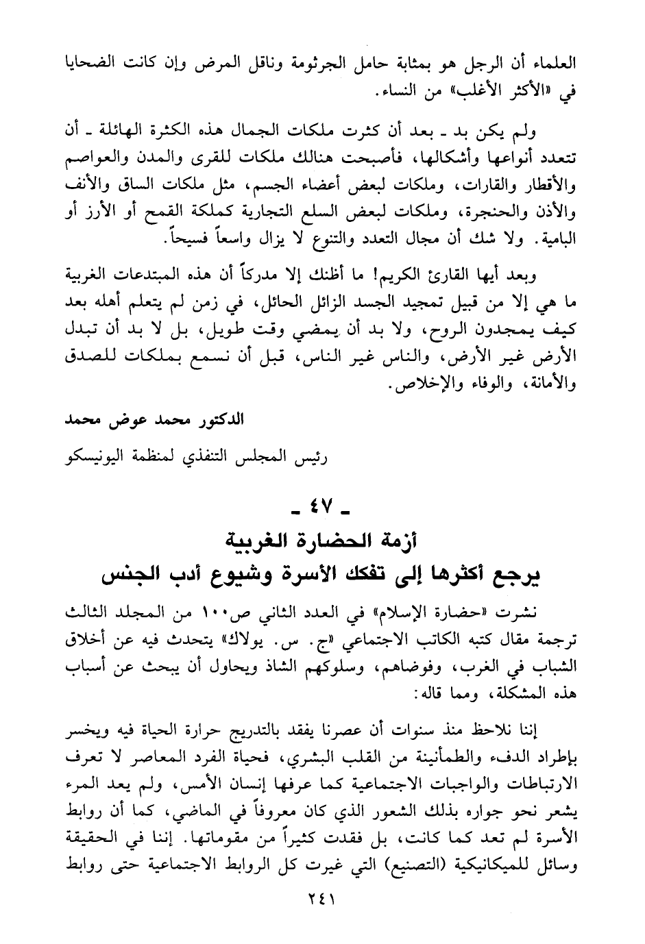 الملاحق - أزمة الحضارة الغربية يرجع أكثرها الى تفكك الأسرة وشيوع أدب الجنس