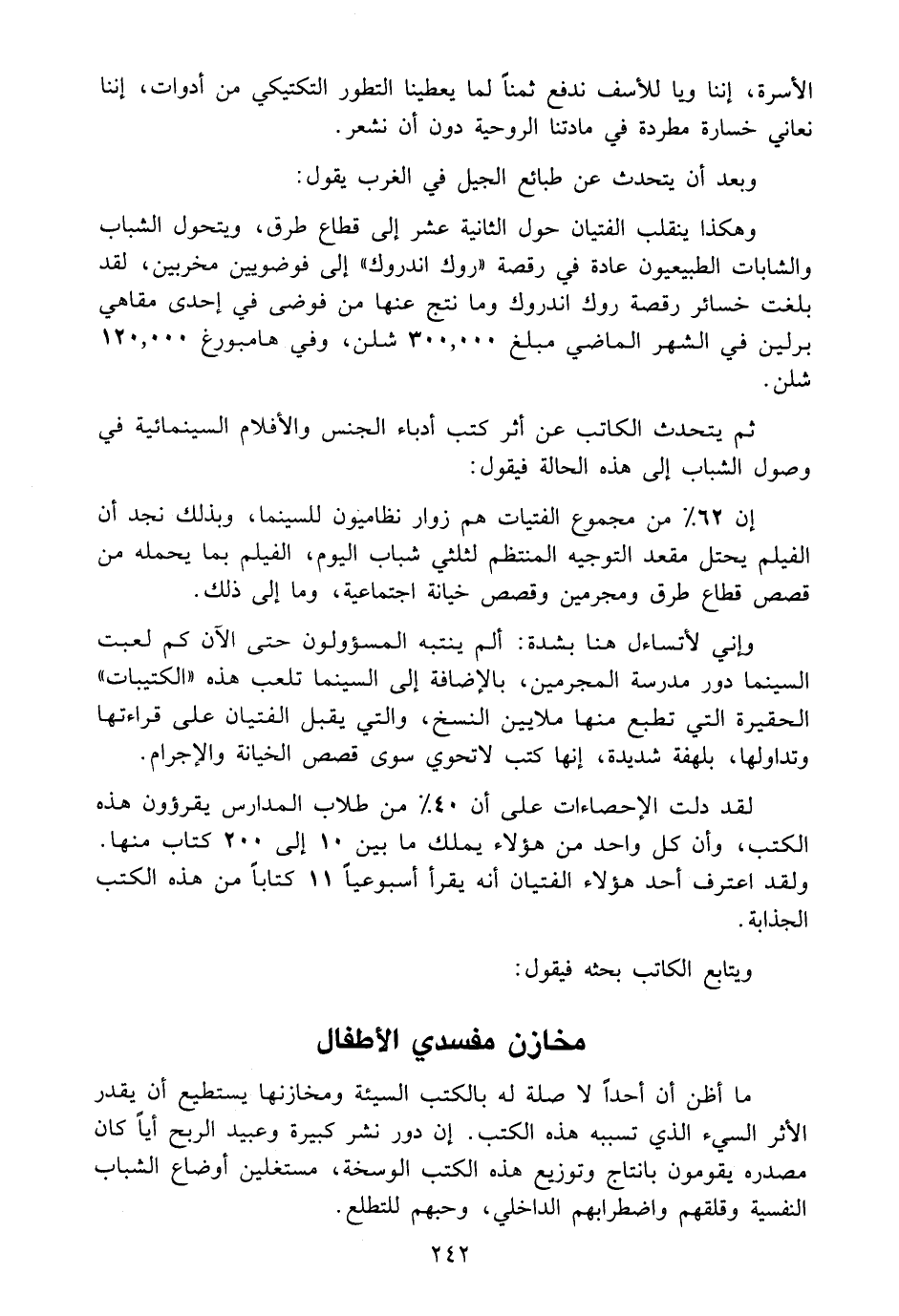 وإني لأتساءل هنا بشدة: ألم ينتبه المسؤولون حتى الآن كم لعبت السينما دور مدرسة المجرمين، بالاضافة الى السينما تلعب هذه "الكتيبات" الحقيرة التي تطبع منها ملايين النسخ، والتي يقبل الفتيان على قراءتها وتدوالها، بلهفة شديدة، إنها كتب لا تحوي سوى قصص الخيانة والاجرام.