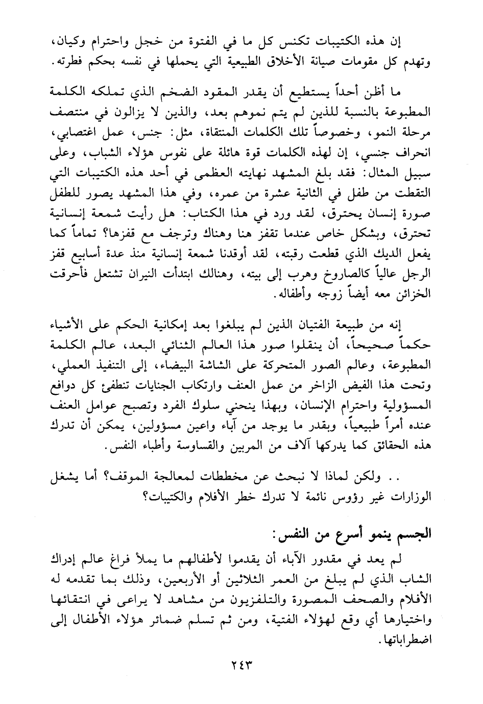 ان هذه الكتيبات تكنس كل ما في الفتوة من خجل واحترام وكيان، وتهدم كل مقومات صيانة الأخلاق الطبيعية التي يحملها في نفسه بحكم فطرته.