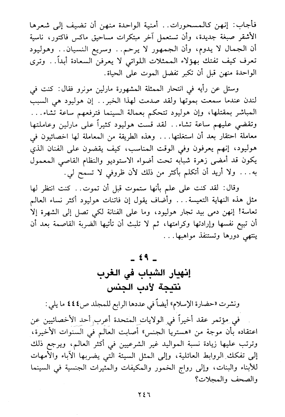فأجاب: انهن كالمسحورات .. امنية الواحدة منهن أن تضيف الى شعرها الأشقر صبغة جديدة، وأن تستعمل آخر مبتكرات مساحيق ماكس فاكتور، ناسية ان الجمال لا يدوم، وان الجمهور لا يرحم ... وسريع النسيان .. وهوليود تعرف كيف تفتك بهؤلاء الممثلات اللواتي لا يعرفن السعادة أبداً ... وترى الواحدة منهن قبل أن تكبر تفضل الموت على الحياة ...