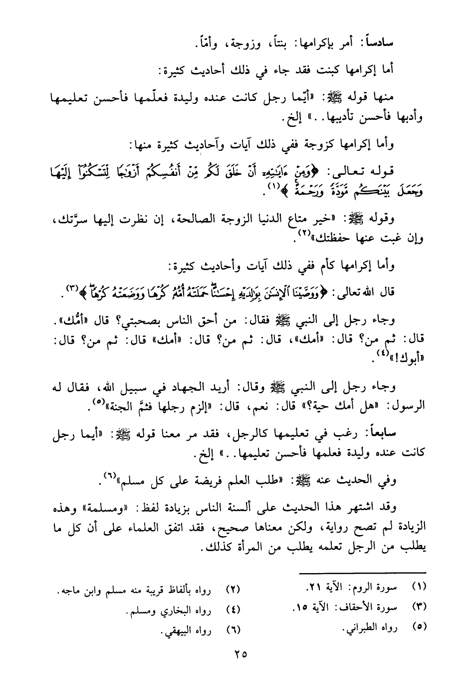 سادساً: أمر بإكرامها: بنتاً، وزوجة، وأماً.