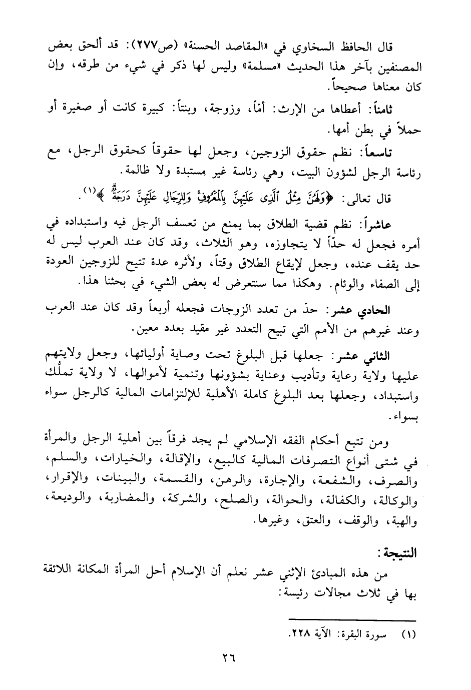 من هذه المبادئ الاثنى عشر نعلم أن الاسلام أحل المرأة المكانة اللائقة بها في ثلاث مجالات رئيسية: