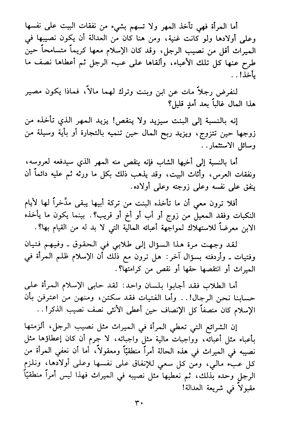 لقد وجهت مرة هذا السؤال على طلابي في الحقوق - وفيهم فتيان وفتيات - وأردفته بسؤال آخر: هل ترون مع ذلك أن الاسلام ظلم المرأة في الميراث أو انتقصها حقها أو نقص من كرامتها؟