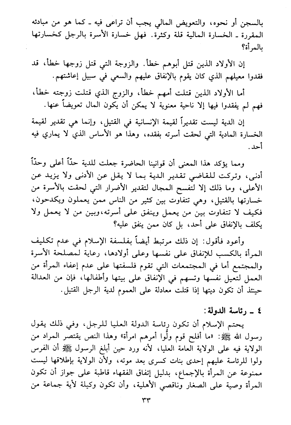 وأعود فأقول ان ذلك مرتبط أيضاً بفلسفة الاسلام في عدم تكليف المرأة بالكسب للانفاق على نفسها وعلى أولادها، رعاية لمصلحة الأسرة والمجتمع اما في المجتمعات التي تقوم فلسفتها على عدم اعفاء المرأة من العمل لتعيل نفسها وتسهم في الانفاق على بيتها واطفالها، فان من العدالة حينئذ أن تكون ديتها اذا قتلت معادلة على العموم لدية الرجل القتيل.