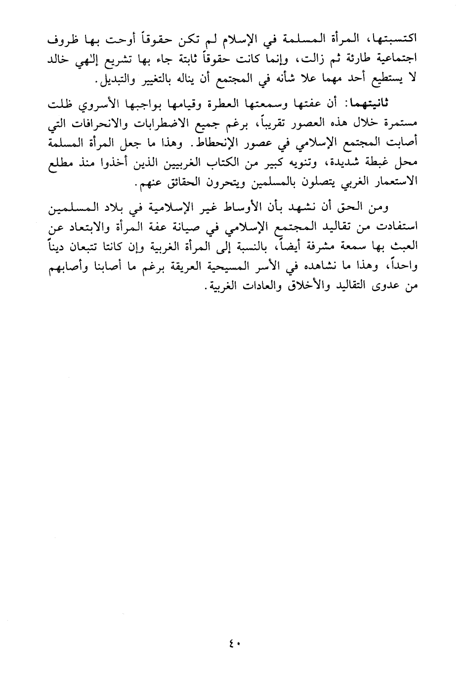 ثانيهما: إن عفتها وسمعتها العطرة وقيامها بواجبها الاسروي ظلت مستمرة خلال هذه العصور تقريباً، برغم جميع الاضطرابات والانحرافات التي أصابت المجتمع الاسلامي في عصور الانحطاط. وهذا ما جعل المرأة المسلمة محل غبطة شديدة، وتنويه كبير من الكتاب الغربيين الذين أخذوا منذ مطلع الاستعمار الغربي يتصلون بالمسلمين ويتحرون الحقائق عنهم.