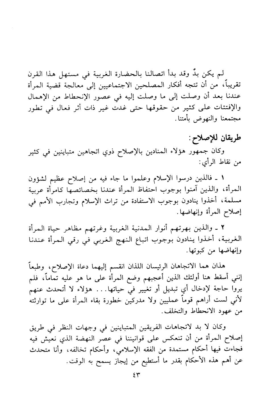 1 - فالذين درسوا الاسلام وعلموا ما جاء فيه من اصلاح عظيم لشؤون المرأة، والذين آمنوا بوجوب احتفاظ المرأة عندنا بخصائصها كامرأة عربية مسلمة، أخذوا ينادون بوجوب الاستفادة من تراث الاسلام وتجارب الأمم في اصلاح المرأة وإنهاضها.