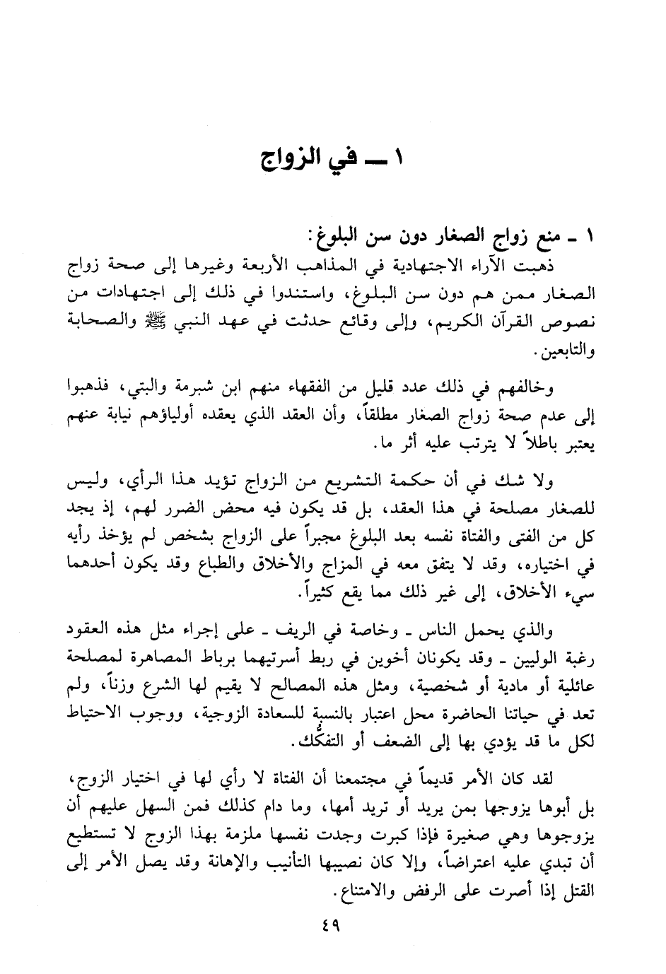 ولا شك في أن حكمة التشريع من الزواج يؤيد هذا الرأي، وليس للصغار مصلحة في هذا العقد، بل قد يكون فيه محض الضرر لهم، إذ يجد كل من الفتى والفتاة نفسه بعد البلوغ مجبراً على الزواج بشخص لم يؤخذ رأيه في اختياره، وقد لا يتفق معه في المزاج والأخلاق والطباع وقد يكون احدهما سيء الأخلاق، الى غير ذلك مما يقع كثيراً.