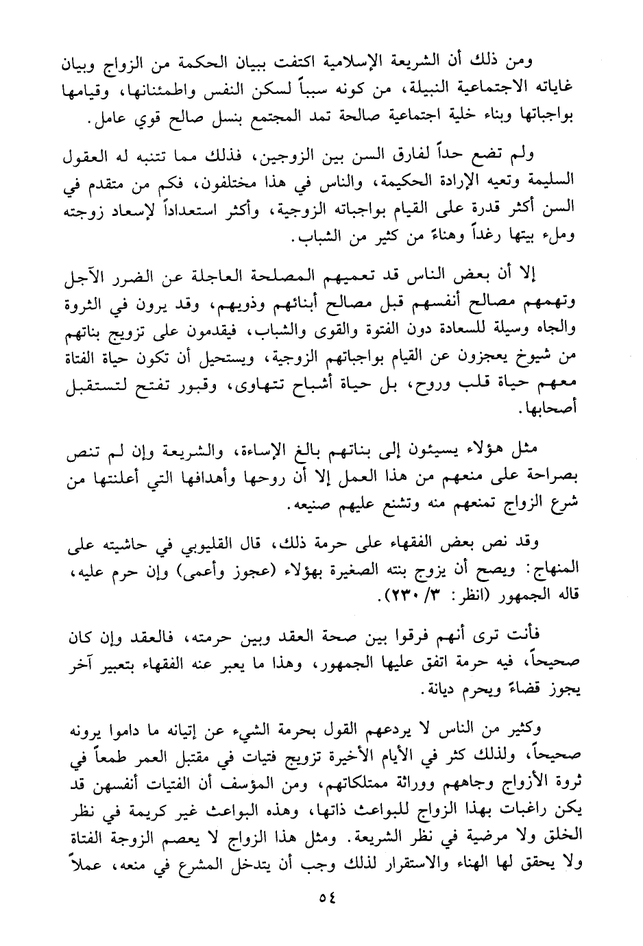 وكثير من الناس لا يردعهم القول بحرمة الشيء عن اتيانه ماداموا يرونه صحيحاً، ولذلك كثر في الأيام الأخيرة تزويج فتيات في مقتبل العمر طمعاً في ثروة الأزواج وجاههم ووراثة ممتلكاتهم، ومن المؤسف أن الفتيات أنفسهن قد يكن راغبات بهذا الزواج للبواعث ذاتها، وهذه البواعث غير كريمة في نظر الخلق ولا مرضية في نظر الشريعة، ومثل هذا الزواج لا يعصم الزواج الفتاة ولا يحقق لها الهناء والاستقرار لذلك وجب أن يتدخل المشرع في منعه، عملاً