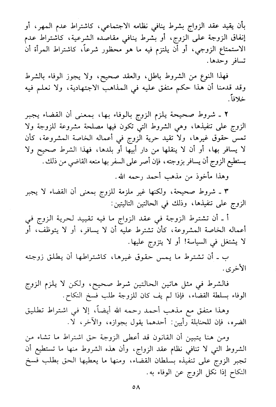ومن هنا تبين أن القانون قد أعطى الزوجة حق اشتراط ما تشاء من الشروط التي لا تنافي نظام عقد الزواج، وأن هذه الشروط منها ما تستطيع ان تجبر الزوج على تنفيذه بسلطان القضاء، ومنها ما يعطيها الحق بطلب فسخ النكاح اذا نكل الزوج عن الوفاء به.