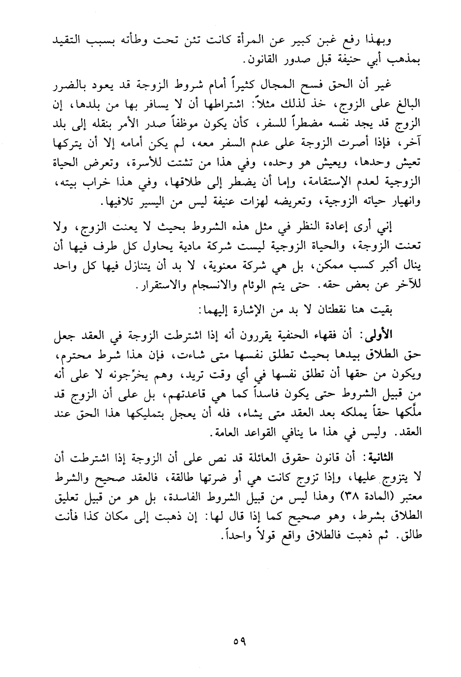 غير أن الحق فسح المجال كثيراً أمام شروط الزوجة قد يعود بالضرر البالغ على الزوج، خذ لذلك مثلاً: اشتراطها أن لا يسافر بها من بلدها، ان الزوج قد يجد نفسه مضطراً للسفر، كأن يكون موظفاً صدر الأمر بنقله الى بلد آخر، فاذا أصرت الزوجة على عدم السفر معه، لم يكن أمامه إلا أن يتركها تعيش وحدها، ويعيش هو وحده، وفي هذا من تشتت للأسرة، وتعرض الحياة الزوجية لعدم الاستقامة، وإما أن يضطر الى طلاقها، وفي هذا خراب بيته، وانهيار حياته الزوجية، وتعريضه لهزات عنيفة ليس من اليسير تلافيها.