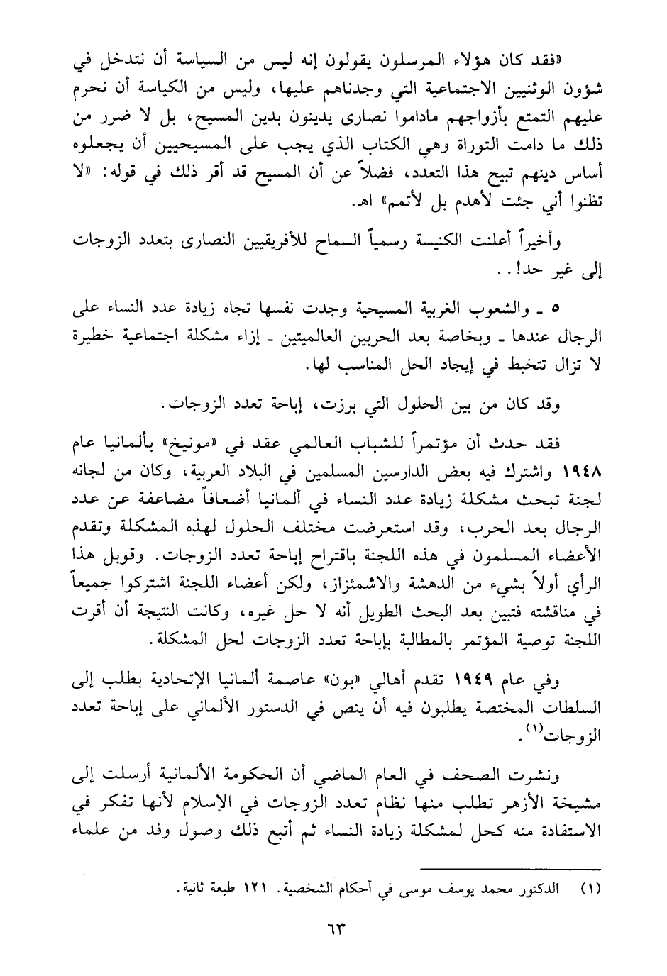5 - والشعوب الغربية المسيحية وجدت نفسها تجاه زيادة عدد النساء على الرجال عندها - وبخاصة بعد الحربين العالمينين - إزاء مشكلة اجتماعية خطيرة لا تزال تتخبط في ايجاد الحل المناسب لها.