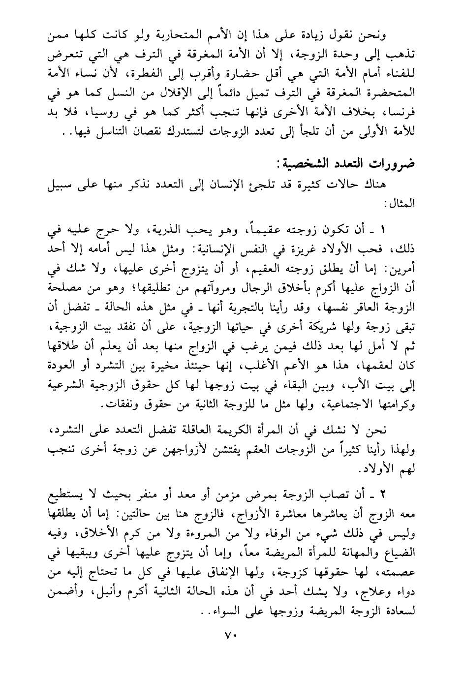 ونحن نقول زيادة على هذا إن الأمم المتحاربة ولو كانت كلها ممن تذهب إلى وحدة الزوجة، إلا أن الأمة المغرقة في الترف هي تتعرض للفناء أمام الأمة التي هي أقل حضارة وأقرب الى الفطرة، لأن نساء الأمة المتحضرة المغرقة في الترف تميل دائماً الى الإقلال من النسل كما هو في فرنسا، بخلاف الأمة الأخرى فإنها تنجب أكثر كما هو في روسيا، فلا بد للأمة الأولى من أن تلجأ إلى تعدد الزوجات لتسدرك نقصان التناسل فيها ...