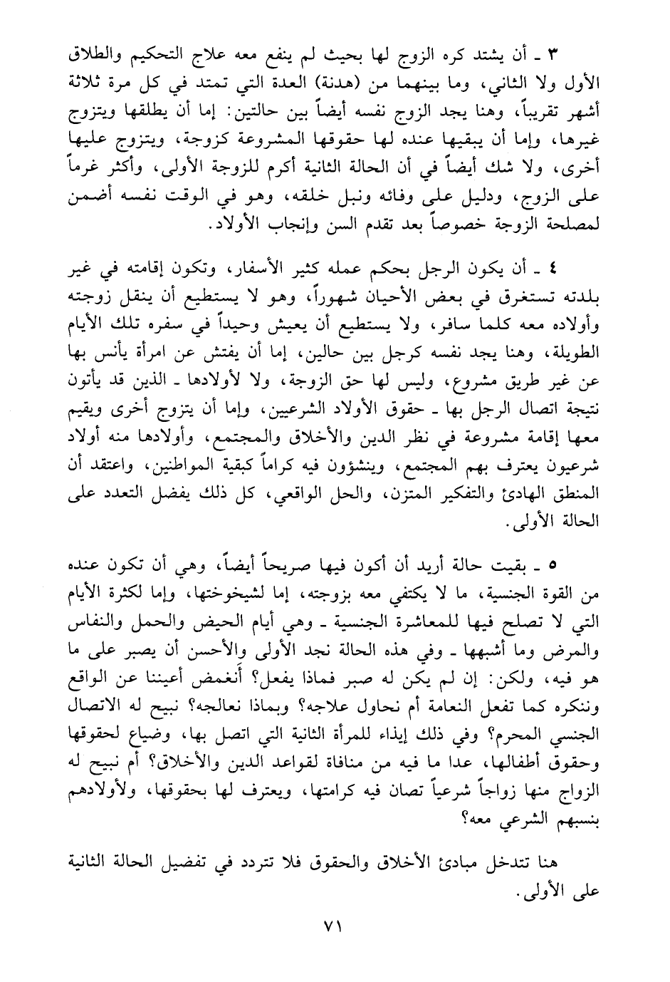 5 - بقيت حالة أريد أن أكون فيها صريحاً أيضاً، وهي أن يكون عنده من القوة الجنسية، ما لا يكتفي معه بزوجته، إما لشيخوختها، وإما لكثرة الأيام التي لا تصلح فيها للمعاشرة الجنسية - وهي أيام الحيض والحمل والنفاس والمرض وما أشبهها - وفي هذه الحالة نجد الأولى والأحسن أن يصبر على ما هو فيه، ولكن: إذا لم يكن له صبر فماذا يفعل؟ انغمض أعيننا عن الواقع وننكره كما تفعل النعامة أم نحاول علاجه؟ وبماذا نعالجه؟ نبيح له الاتصال الجنسي المحرم؟ وفي ذلك إيذاء للمرأة الثانية التي اتصل بها، وضياع لحقوقها وحقوق أطفالها، عدا ما فيه من منافاة لقواعد الدين والأخلاق؟ أم نبيح له الزواج منها زواجاً شرعياً تصان فيه كرامتها، ويعترف لها بحقوقها، ولأولادهم بنسبهم الشرعي معه؟
